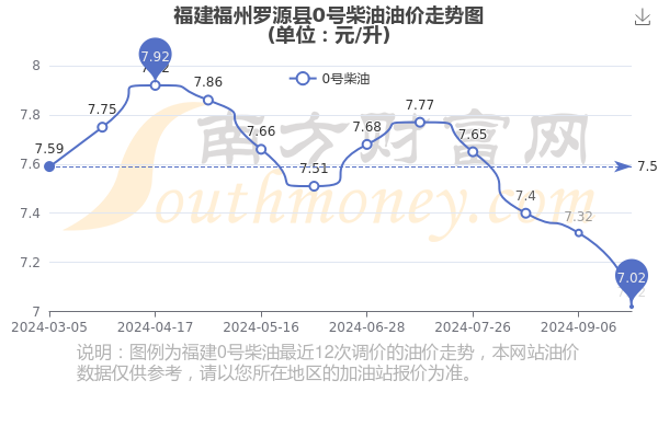 福建福州罗源县0号柴油10月4日最新价格为7.02元/升,为9月21日油价调整后的价格,相对上次调整时间9月6日的油价7.32元每升,降了0.3元,降4.098%。