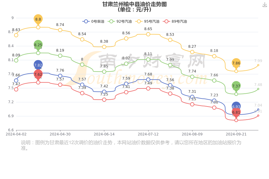 甘肃兰州榆中县汽油、柴油10月19日每升的价格为10月11日调整后的价格:92号汽油7.48元;95号汽油7.99元;89号汽油6.91元;0号柴油7.04元。