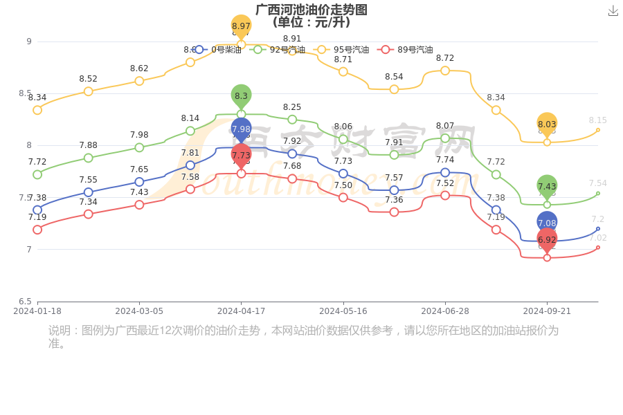 10月23日广西河池汽油柴油每升的价格为10月11日调整后的价格,具体如下:92号汽油7.54元;95号汽油8.15元;89号汽油7.02元;0号柴油7.2元。
