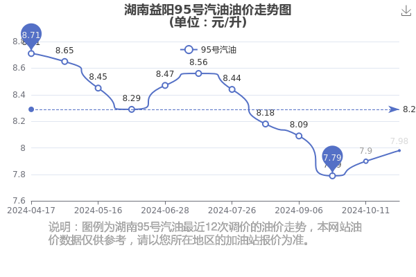 10月26日,湖南益阳95号汽油价格为每升7.98元,这是10月24日油价调整后的价格,相对上次调整时间10月11日的油价7.9元每升,上调了0.08元,上调0.963%。