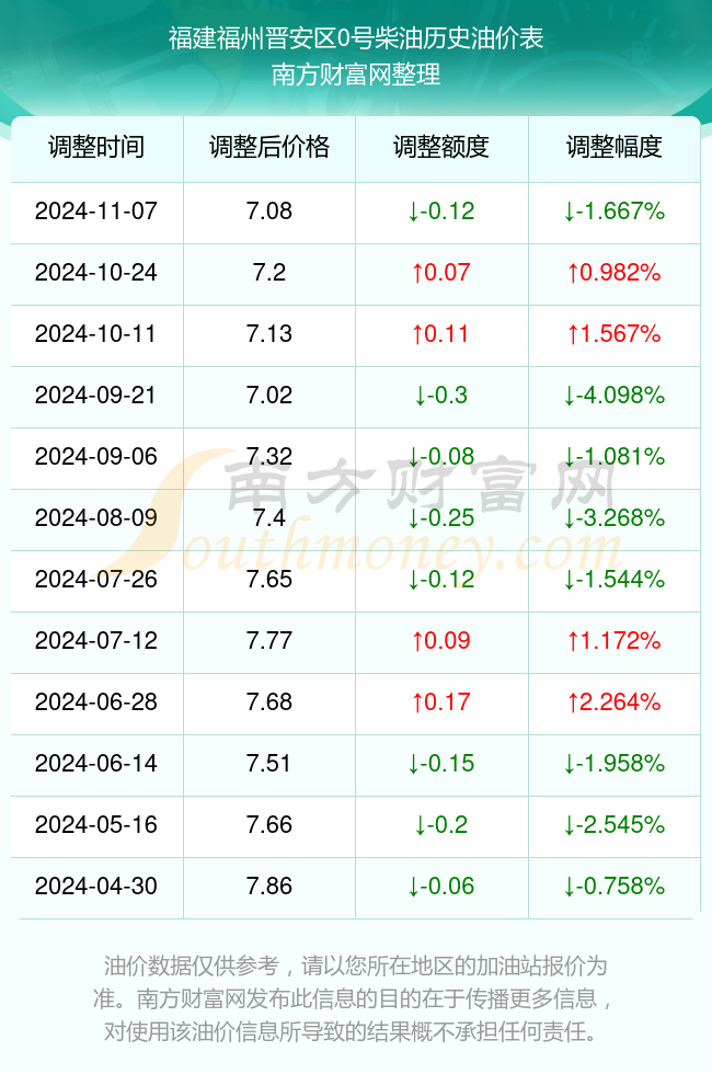 福建福州晋安区0号柴油历史油价表