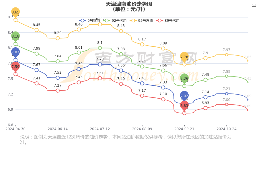 天津津南汽油柴油11月21日的价格每升多少钱?具体为:92号汽油为7.43元,下降了0.12元;95号汽油为7.85元,下降了0.12元;89号汽油为6.89元,下降了0.11元;0号柴油为7.09元,下降了0.12元,本轮油价的调整时间为11月7日。