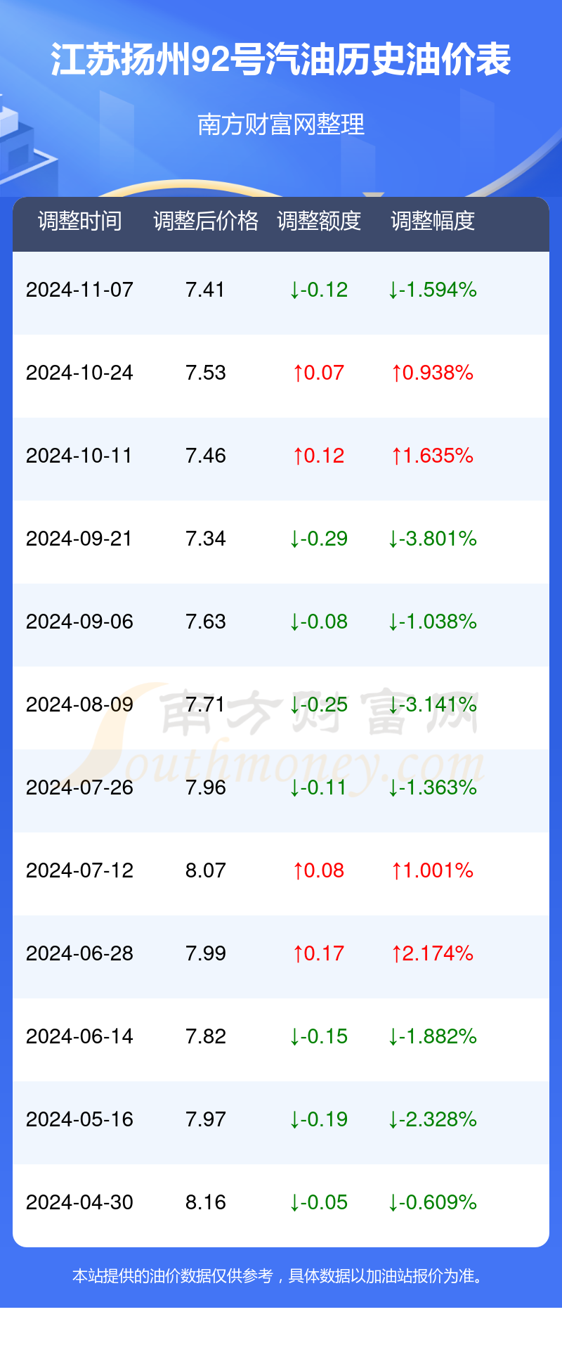 以上数据仅供参考,请以您所在地区的加油站实际售价为准。南方财富网发布此信息的目的在于传播更多信息,对使用该油价信息所导致的结果概不承担责任。