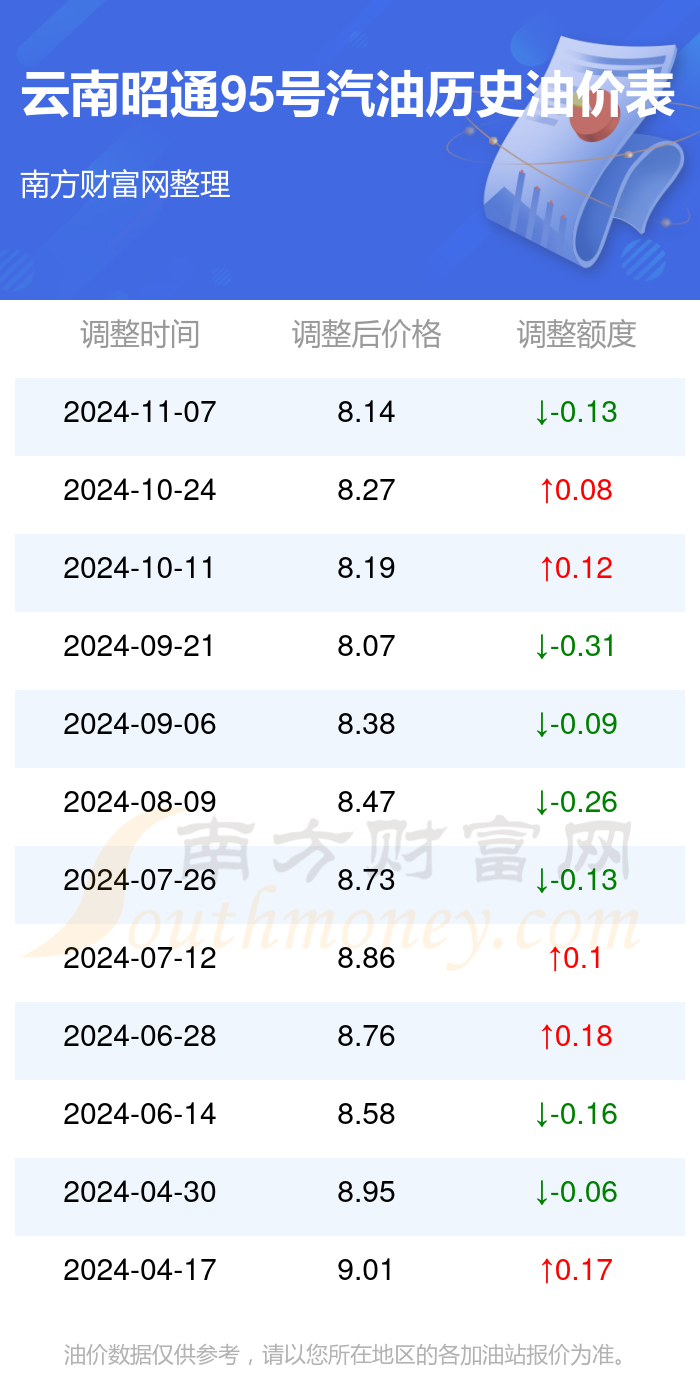 云南昭通95号汽油12月4日的最新价格:11月7日油价调整后,云南昭通95号汽油8.14元/升,相对上次调整时间10月24日的油价8.27元每升,降了0.13元,降1.572%。