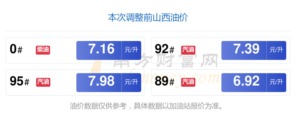1月10日山西汽油、柴油每升的价格为1月3日调整后的价格,92号汽油为7.45元,上调了0.06元,上调幅达0.81%;95号汽油为8.04元,上调了0.06元,上调幅达0.75%;89号汽油为6.97元,上调了0.05元,上调幅达0.72%;0号柴油为7.22元,上调了0.06元,上调幅达0.84%。