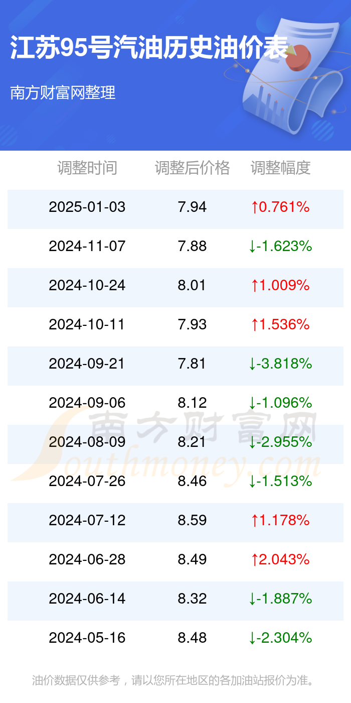 1月15日江苏95号汽油价格是1月3日调整后的价格,为7.94元每升,相对上一轮调整时间11月7日的油价7.88元/升,涨了0.06元。