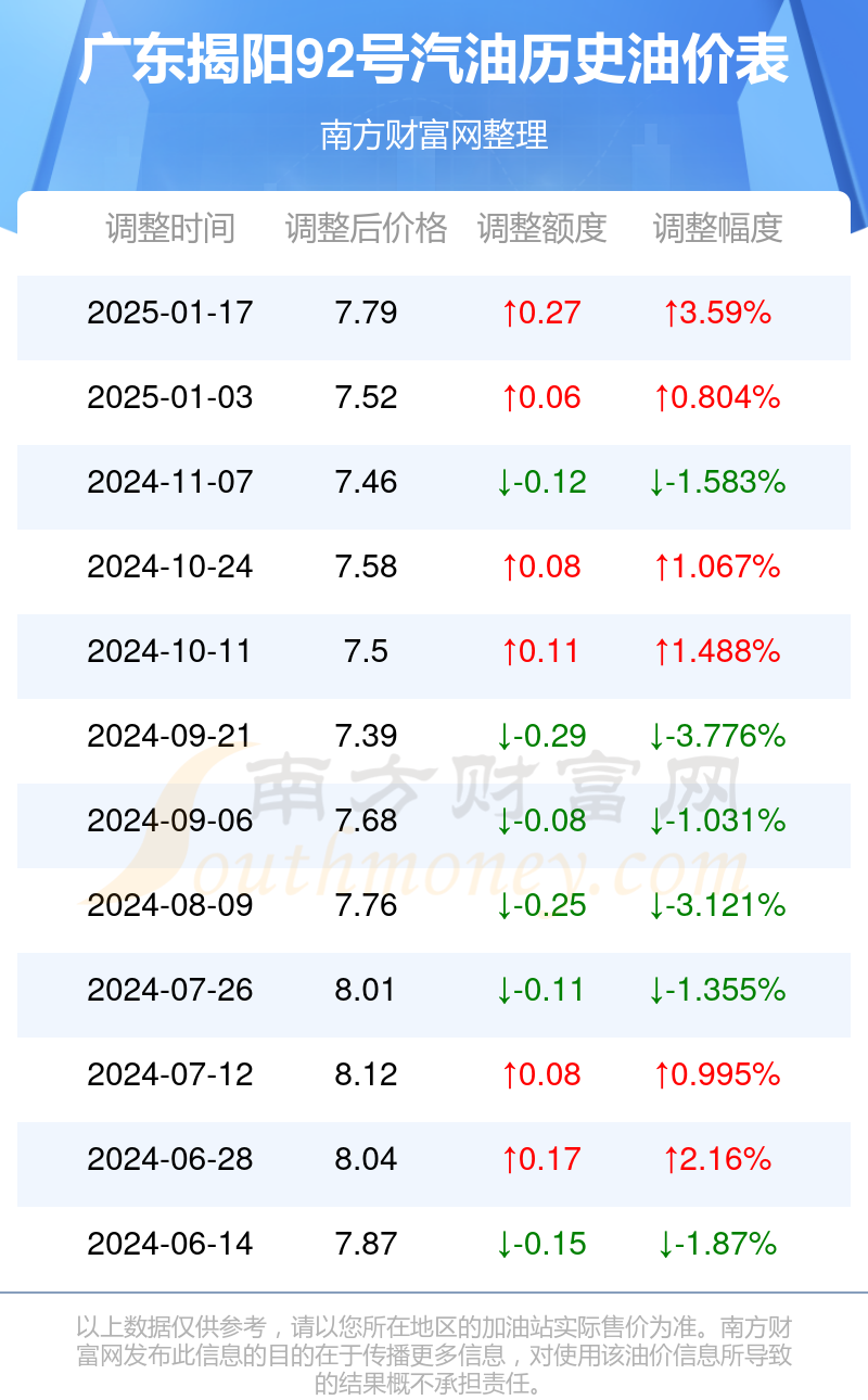 广东揭阳92号汽油历史油价表