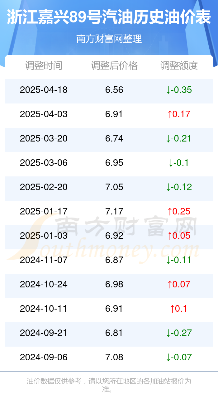 浙江嘉兴89号汽油5月18日的最新价格:4月18日油价调整后,浙江嘉兴89号汽油6.56元/升,相对上次调整时间4月3日的油价6.91元每升,降了0.35元,降5.065%。
