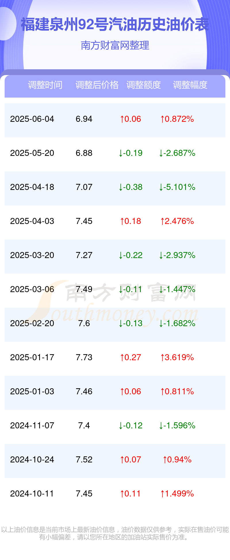 以上数据仅供参考,请以您所在地区的加油站实际售价为准。南方财富网发布此信息的目的在于传播更多信息,对使用该油价信息所导致的结果概不承担责任。