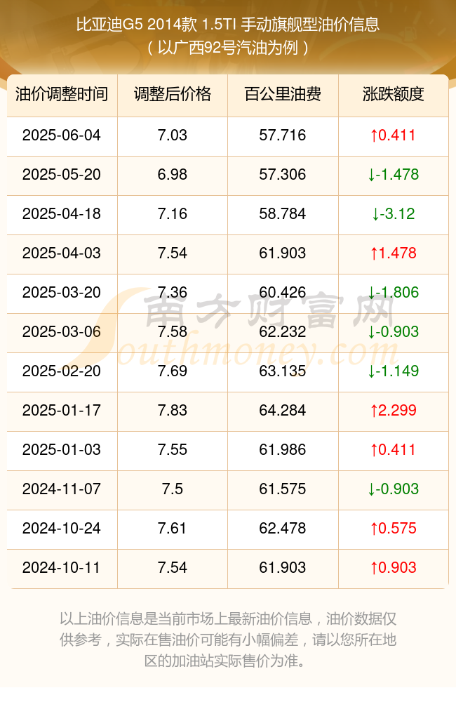 依照6月4日92号汽油最新调整价格7.03元/升来计算(以广西为例),该车型百公里的平均油费是57.716元,依照上一轮5月20日调整价格6.98元/升来计算,百公里的平均油费是57.306元,对比上一轮多花0.411元,下一轮的油价调整时间6月17日24时。