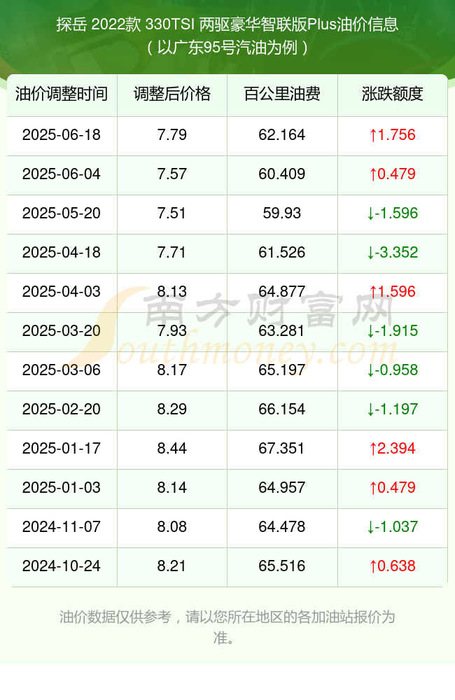 依照6月18日95号汽油最新调整价格7.79元/升来计算(以广东为例),该车型百公里的平均油费是62.164元,依照上一轮6月4日调整价格7.57元/升来计算,百公里的平均油费是60.409元,对比上一轮多花1.756元,下一轮的油价调整时间7月1日24时。