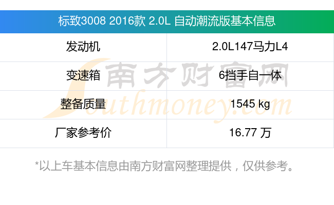 标致3008 2016款 2.0L 自动潮流版搭载了一台2.0L147马力L4自然吸气发动机,采用6挡手自一体自动档变速箱,常规整备质量1545kg,厂家参考价16.77万元。