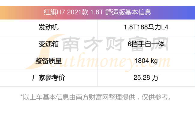 红旗H7 2021款 1.8T 舒适版动力上搭载的是一台1.8T188马力L4涡轮增压发动机,匹配6挡手自一体自动档变速箱,燃料形式为汽油,常规整备质量1804kg,厂家参考价25.28万元。