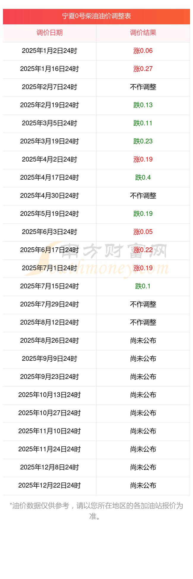 银川灵武市8月24日0号柴油历史油价调整一览表