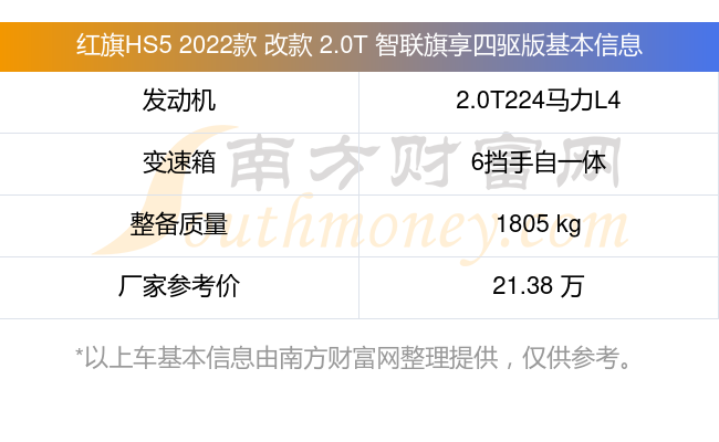红旗HS5 2022款 改款 2.0T 智联旗享四驱版动力上配备的是一台2.0T224马力L4涡轮增压发动机,匹配的是6挡手自一体自动档变速箱,燃料形式为汽油,常规整备质量1805kg,厂家参考价21.38万元。