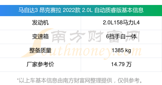 马自达3 昂克赛拉 2022款 2.0L 自动质睿版动力上配备的是一台2.0L158马力L4自然吸气发动机,匹配的是6挡手自一体自动档变速箱,燃料形式为汽油,常规整备质量1385kg,厂家参考价14.79万元。