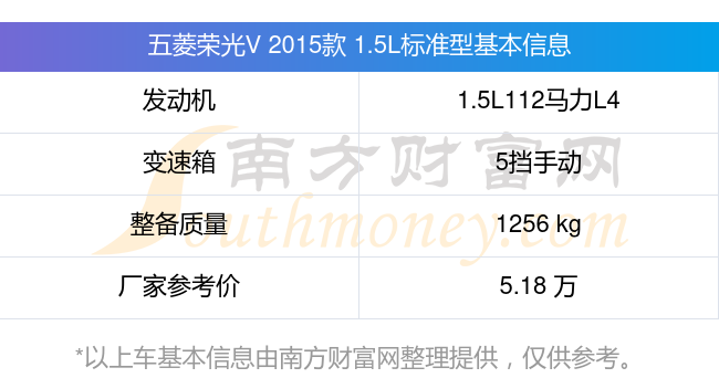 五菱荣光V 2015款 1.5L标准型动力上搭载的是一台1.5L112马力L4自然吸气发动机,匹配5挡手动挡变速箱,燃料形式为汽油,常规整备质量1256kg,厂家参考价5.18万元。