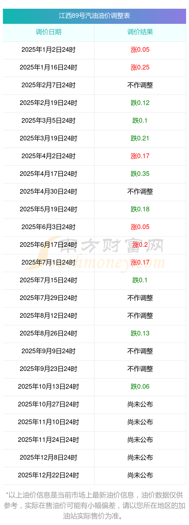 油价数据仅供参考,请以您所在地区的加油站报价为准。南方财富网发布此信息的目的在于传播更多信息,对使用该油价信息所导致的结果概不承担任何责任。