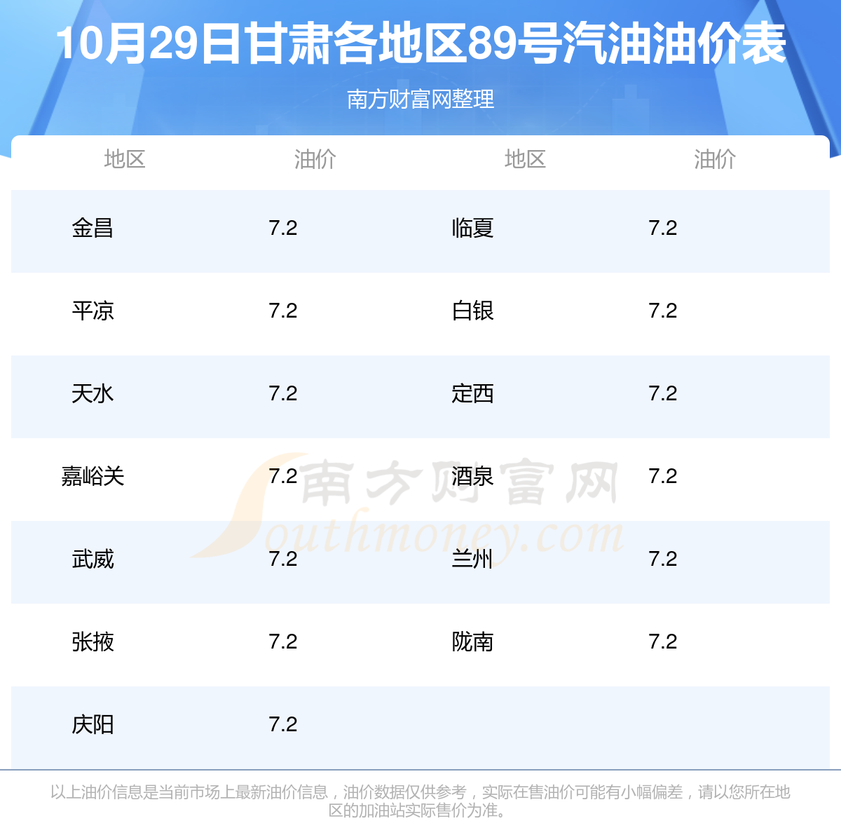 甘肃今日(10月29日)最新油价查询:89号汽油价格