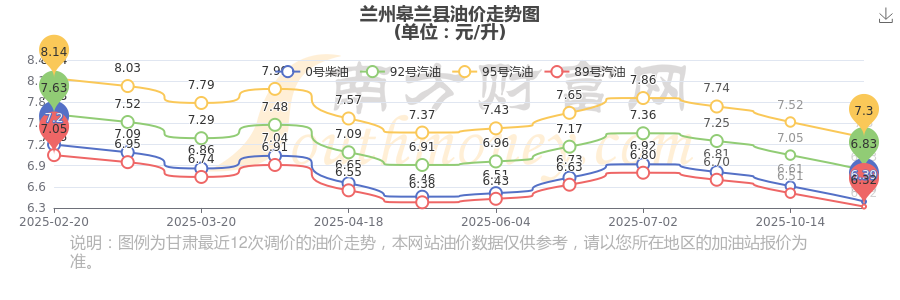 兰州皋兰县汽油、柴油10月31日每升的价格为(油价调整时间是10月28日):92号汽油6.83元;95号汽油7.3元;89号汽油6.32元;0号柴油6.39元。