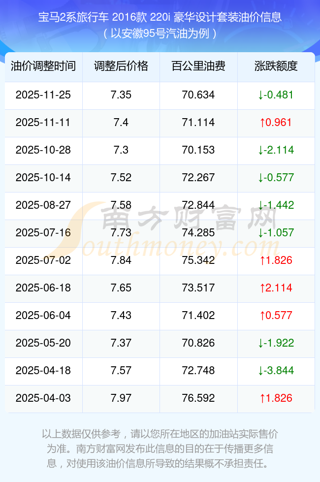 按照11月25日95号汽油最新调整价格7.35元/升来计算(以安徽为例),该车型百公里平均油费为70.634元,按照上一轮11月11日调整价格7.4元/升来计算,百公里平均油费为71.114元,对比上一轮少花0.481元,下一轮油价调整时间为12月8日24时。