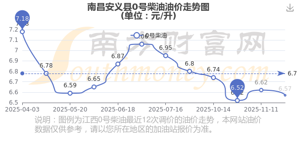 南昌安义县0号柴油12月4日的价格为11月25日调整后的价格,具体为6.57元/升,相对上次调整减了0.05元。