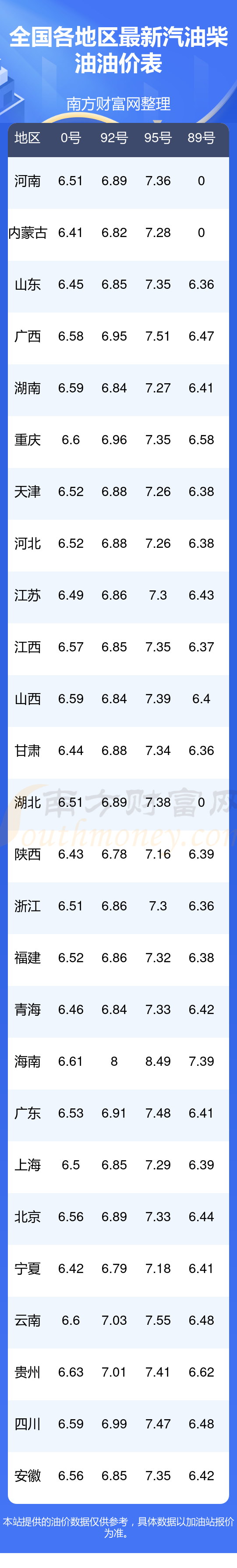 油价数据仅供参考,请以您所在地区的加油站报价为准。南方财富网发布此信息的目的在于传播更多信息,对使用该油价信息所导致的结果概不承担任何责任。