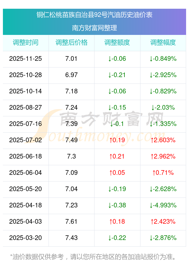 铜仁松桃苗族自治县92号汽油历史油价一览表