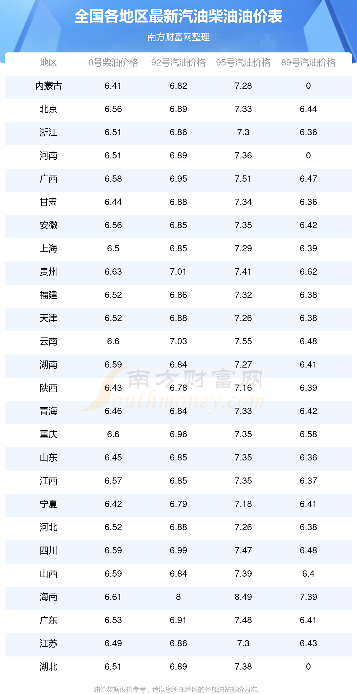 油价数据仅供参考,请以您所在地区的加油站报价为准。南方财富网发布此信息的目的在于传播更多信息,对使用该油价信息所导致的结果概不承担任何责任。