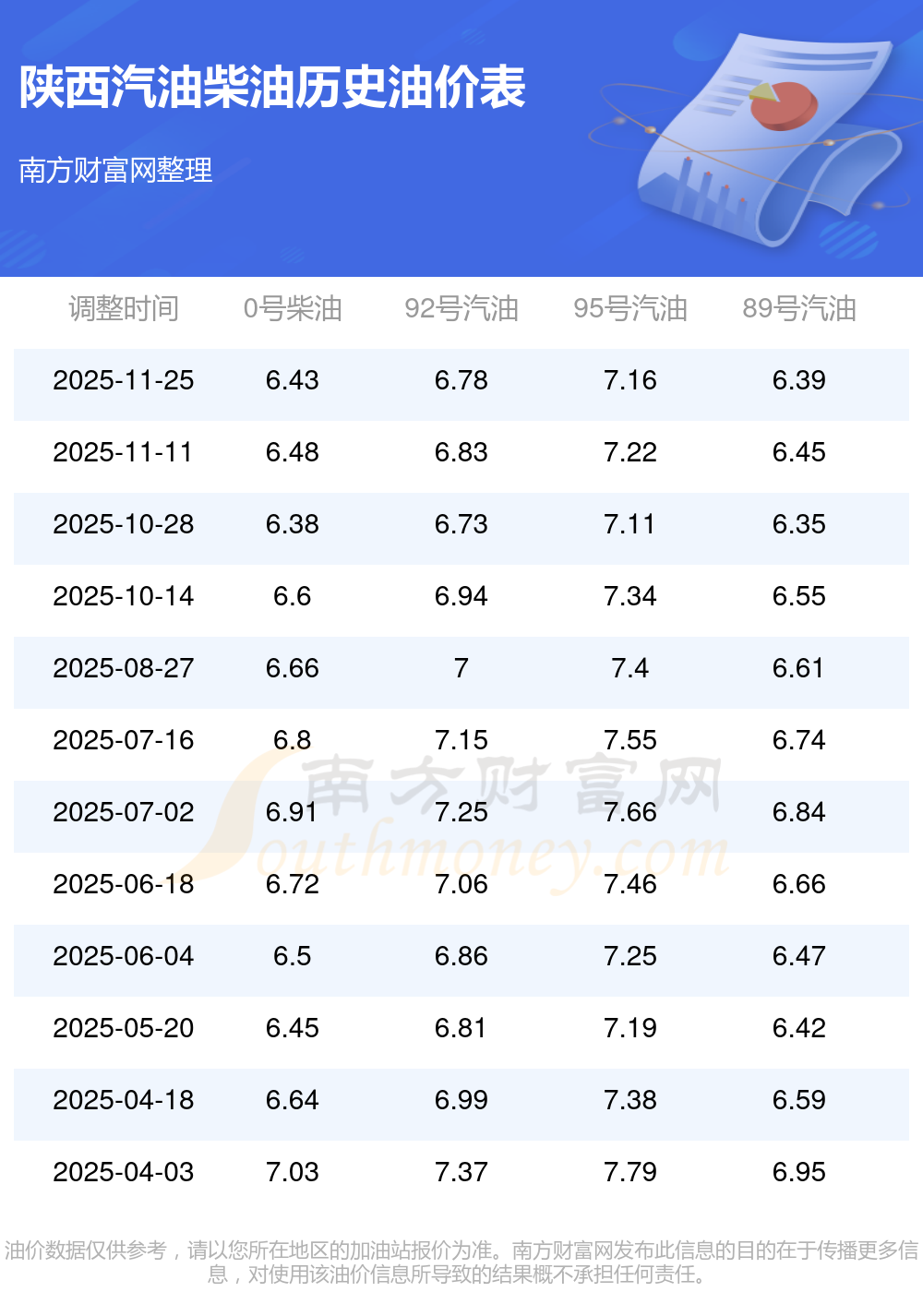 12月4日陕西汽油、柴油每升的价格是多少?11月25日为本轮油价调整时间,92号汽油6.78元,降了0.05元,降幅达0.73%;95号汽油7.16元,降了0.06元,降幅达0.83%;89号汽油6.39元,降了0.06元,降幅达0.93%;0号柴油6.43元,降了0.05元,降幅达0.77%。
