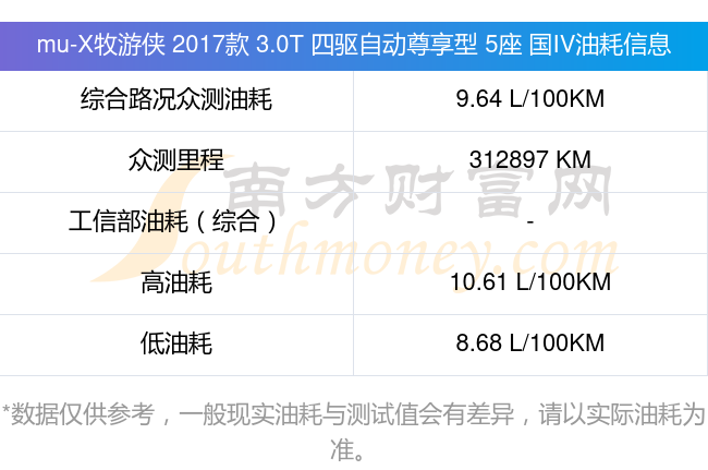 mu-X牧游侠 2017款 3.0T 四驱自动尊享型 5座 国IV搭载了一台3.0T177马力L4涡轮增压发动机,采用5挡手自一体自动档变速箱,常规整备质量2070kg,厂家参考价25.23万元。