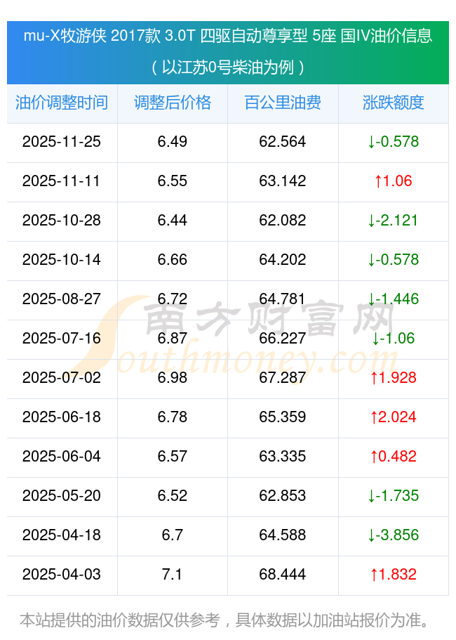依照11月25日0号柴油最新调整价格6.49元/升来计算(以江苏为例),该车型百公里的平均油费是62.564元,依照上一轮11月11日调整价格6.55元/升来计算,百公里的平均油费是63.142元,对比上一轮少花0.578元,下一轮的油价调整时间12月8日24时。