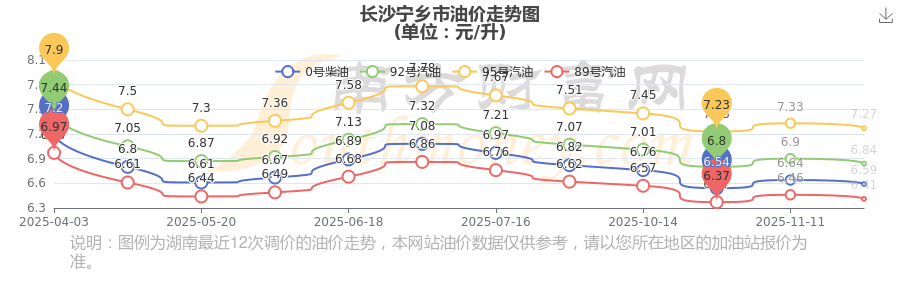 长沙宁乡市汽油、柴油12月4日每升的价格为(油价调整时间是11月25日):92号汽油6.84元;95号汽油7.27元;89号汽油6.41元;0号柴油6.59元。
