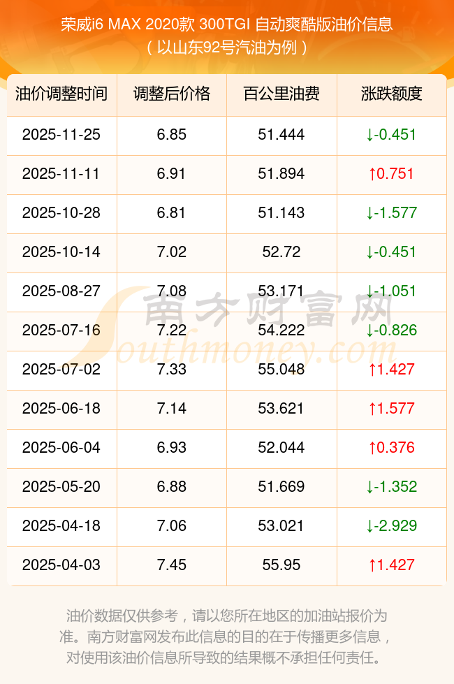 根据11月25日92号汽油最新调整价格6.85元/升来计算(以山东为例),该车型每百公里的平均油费是51.444元,上一轮11月11日调整价格6.91元每升来计算,每百公里的平均油费是51.894元,对比上一轮少花0.451元,下一轮的油价调整时间是12月8日24时。