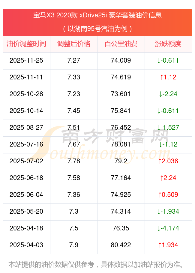 根据11月25日95号汽油最新调整价格7.27元/升来计算(以湖南为例),该车型每百公里的平均油费是74.009元,上一轮11月11日调整价格7.33元每升来计算,每百公里的平均油费是74.619元,对比上一轮少花0.611元,下一轮的油价调整时间是12月8日24时。