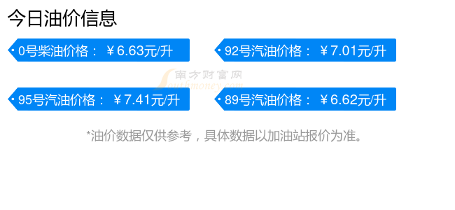 油价数据仅供参考,请以您所在地区的加油站报价为准。南方财富网发布此信息的目的在于传播更多信息,对使用该油价信息所导致的结果概不承担任何责任。