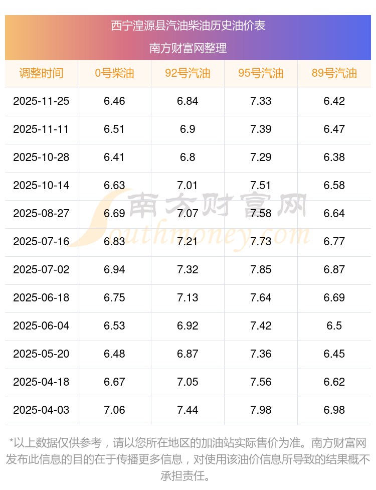 12月4日西宁湟源县汽油每升的价格,具体如下:92号汽油6.84元;95号汽油7.33元;89号汽油6.42元;0号柴油6.46元(该价格为11月25日调整后的价格)。