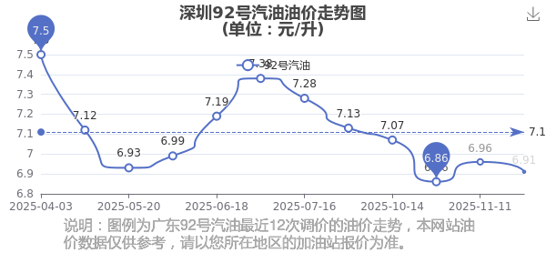 12月4日深圳汽油、柴油每升的价格详情如下:92号汽油6.91元,跌了0.05元;95号汽油7.48元,跌了0.06元;89号汽油6.41元,跌了0.05元;0号柴油6.53元,跌了0.06元,本次油价的调整时间为11月25日。深圳下一轮油价调整时间12月8日24时,距离现在还有4.37天。