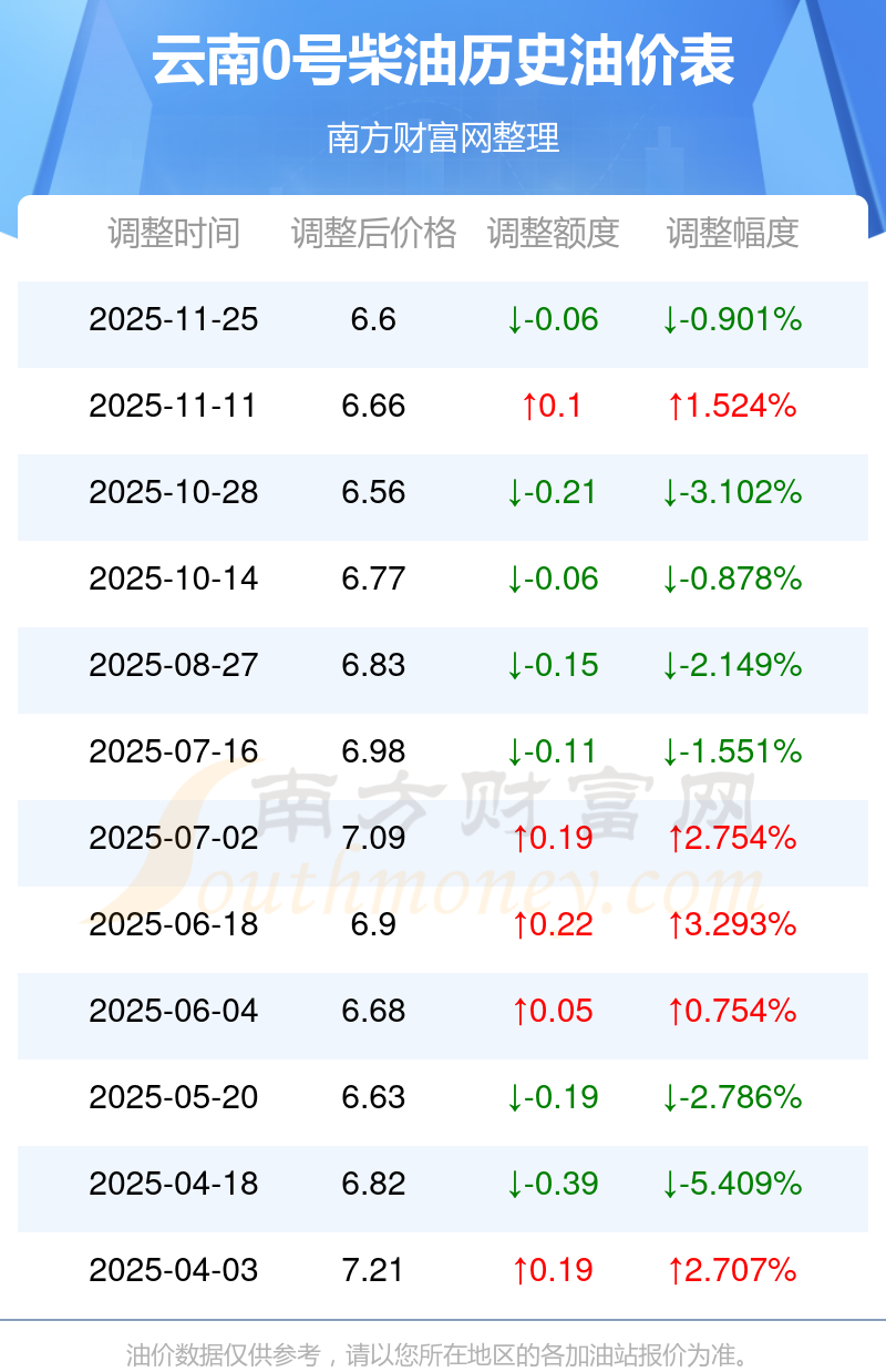 12月4日云南0号柴油的价格是11月25日调整后的价格,为6.6元/升,对比上次调整共跌了0.06元,跌0.901%。