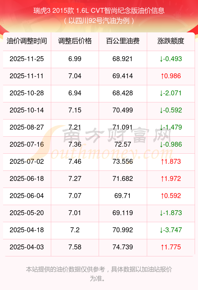 按11月25日92号汽油最新调整价格6.99元每升来计算(以四川为例),该车型百公里平均油费为68.921元,按上一轮11月11日调整价格7.04元每升来计算,百公里平均油费为69.414元,对比上一轮少花0.493元,下一轮油价调整时间为12月8日24时。