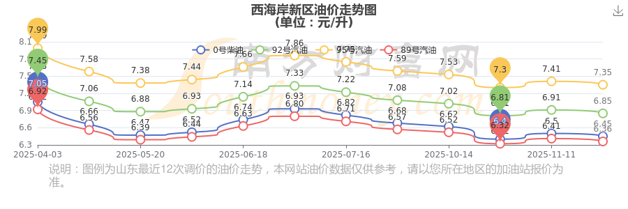 西海岸新区汽油、柴油12月4日每升最新价格为:95号汽油为7.35元,减了0.06元;92号汽油为6.85元,减了0.06元;89号汽油为6.36元,减了0.05元;0号柴油为6.45元,减了0.05元,调整时间为11月25日。