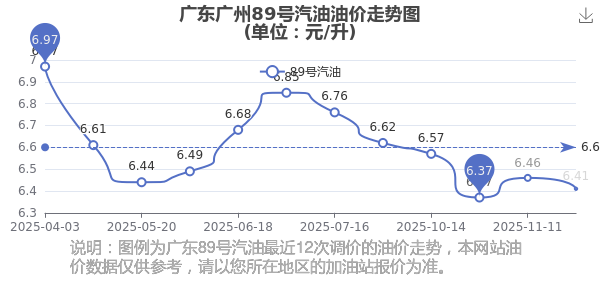 广东广州汽油柴油12月4日每升的价格为11月25日调整后的价格,各油价详情如下:92号汽油6.91元;95号汽油7.48元;89号汽油6.41元;0号柴油6.53元。下一轮油价调整时间12月8日24时,距离现在还有4.36天。