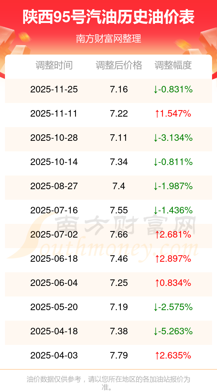 12月4日,陕西95号汽油的价格是7.16元每升,本次的调整时间为11月25日,对比上次的调整降了0.06元,降0.831%,12月8日24时为下一轮油价调整时间,还有4.35天。