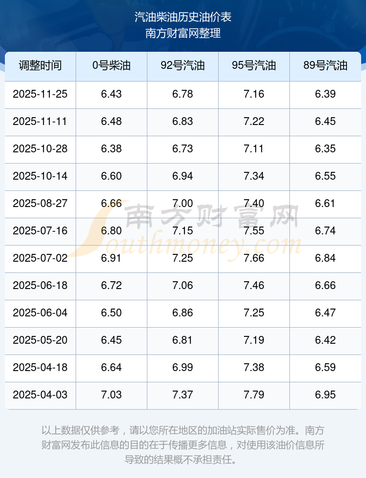 12月4日,陕西宝鸡95号汽油最新价格为:7.16元每升,调整时间为11月25日,相对上次调整时间11月11日的油价7.22元每升,下调了0.06元,下调幅达0.831%。下一轮油价调整时间12月8日24时,距离现在还有4.35天。