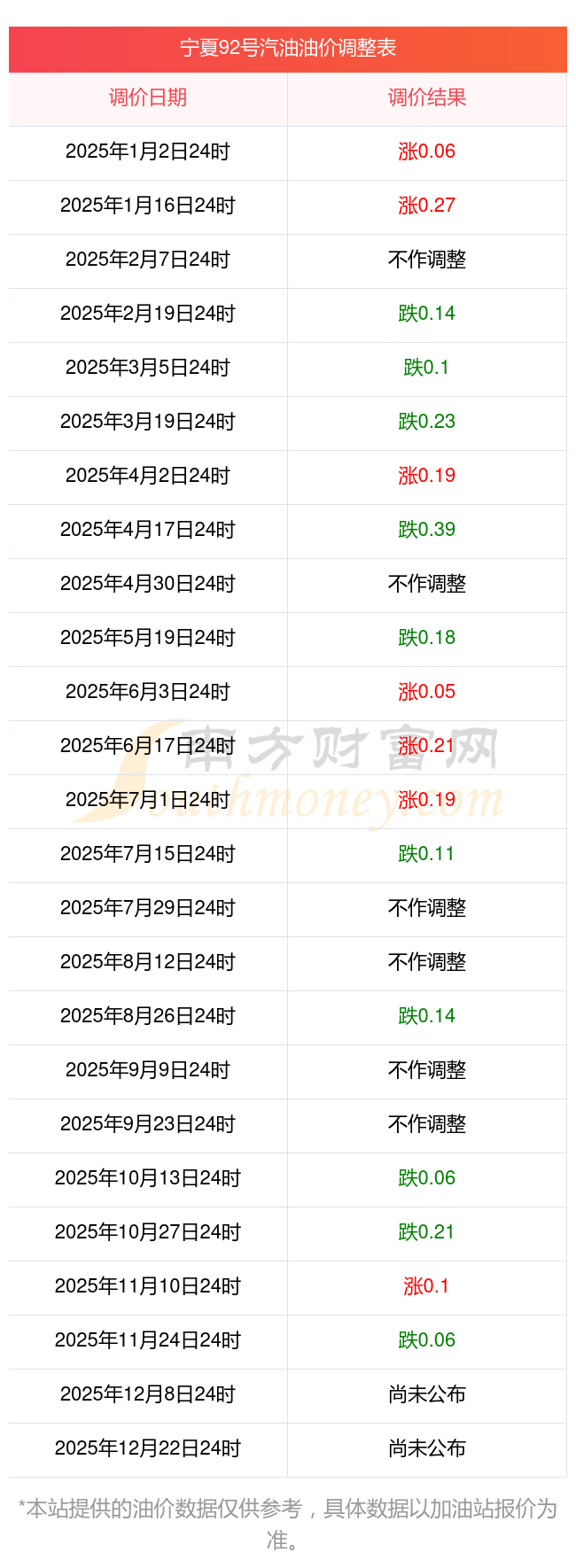 中宁县汽油、柴油12月4日每升最新价格为:92号汽油为6.79元;95号汽油为7.18元;89号汽油为6.41元;0号柴油为6.42元,调整时间为11月25日。