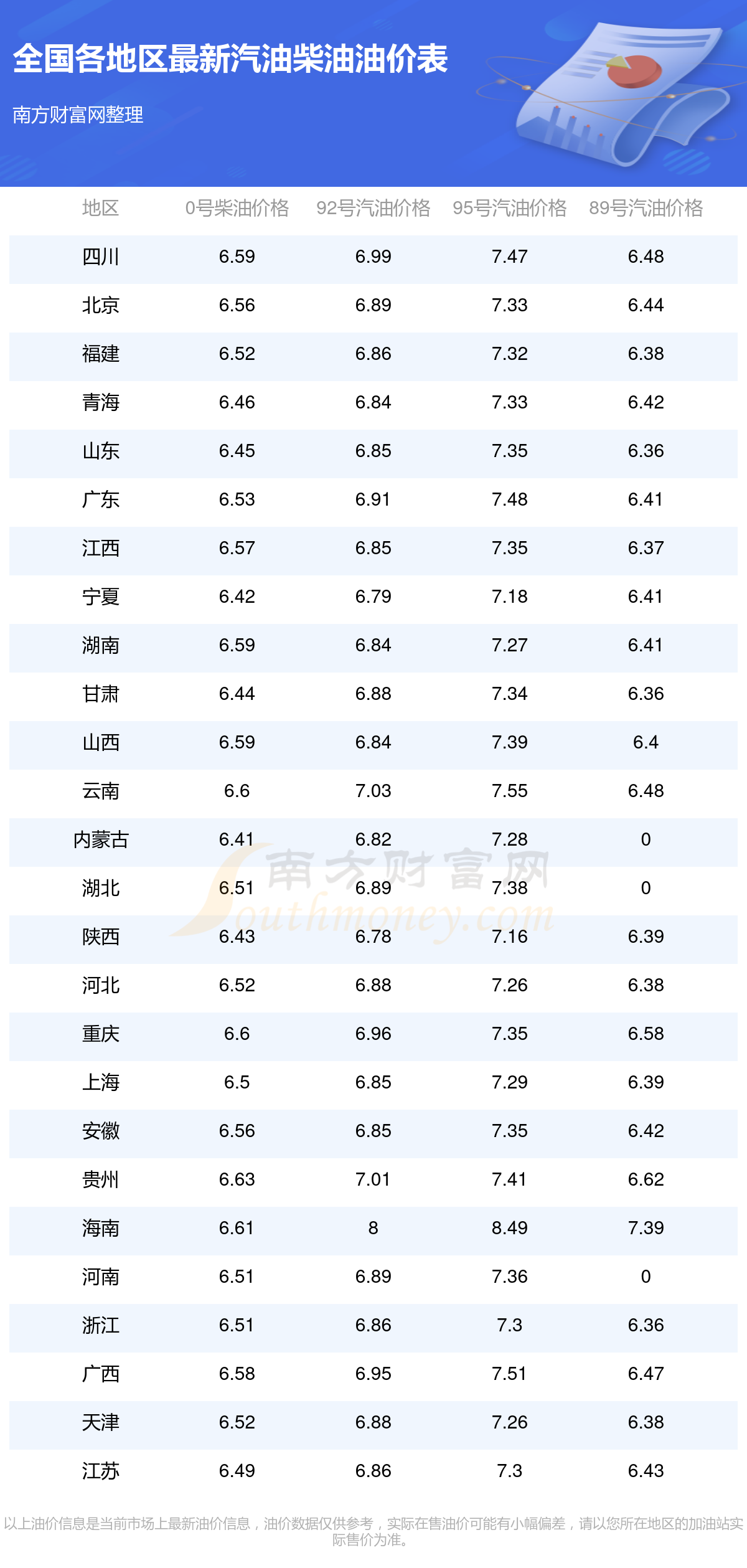 油价数据仅供参考,请以您所在地区的加油站报价为准。南方财富网发布此信息的目的在于传播更多信息,对使用该油价信息所导致的结果概不承担任何责任。