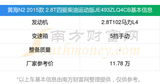 黄海N2 2015款 2.8T四驱柴油运动版JE493ZLQ4CB搭载了一台2.8T102马力L4涡轮增压发动机,采用5挡手动挡变速箱,厂家参考价11.78万元。