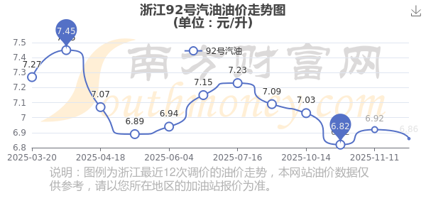 12月4日,浙江汽油、柴油的价格为11月25日调整后的价格。具体为:92号汽油6.86元,下调了0.06元;95号汽油7.3元,下调了0.06元;89号汽油6.36元,下调了0.05;0号柴油6.51元,下调了0.06元。