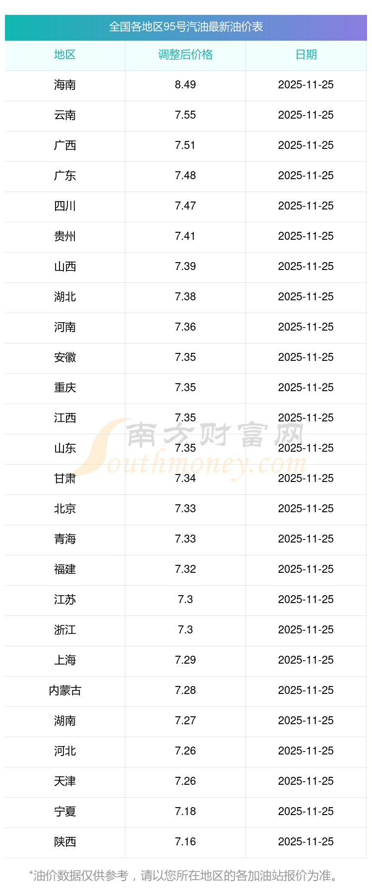 油价数据仅供参考,请以您所在地区的加油站报价为准。南方财富网发布此信息的目的在于传播更多信息,对使用该油价信息所导致的结果概不承担任何责任。