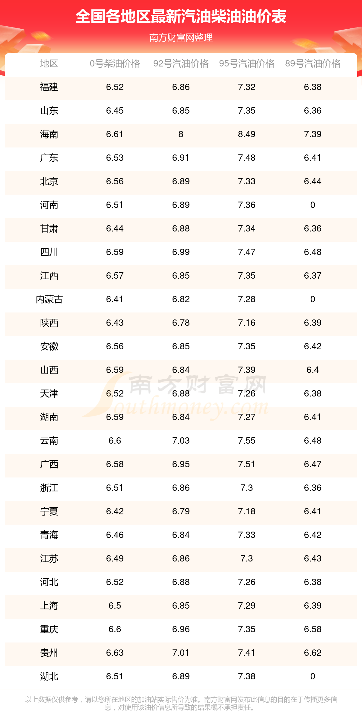 以上油价信息是当前市场上最新油价信息,油价数据仅供参考,实际在售油价可能有小幅偏差,请以您所在地区的加油站实际售价为准。